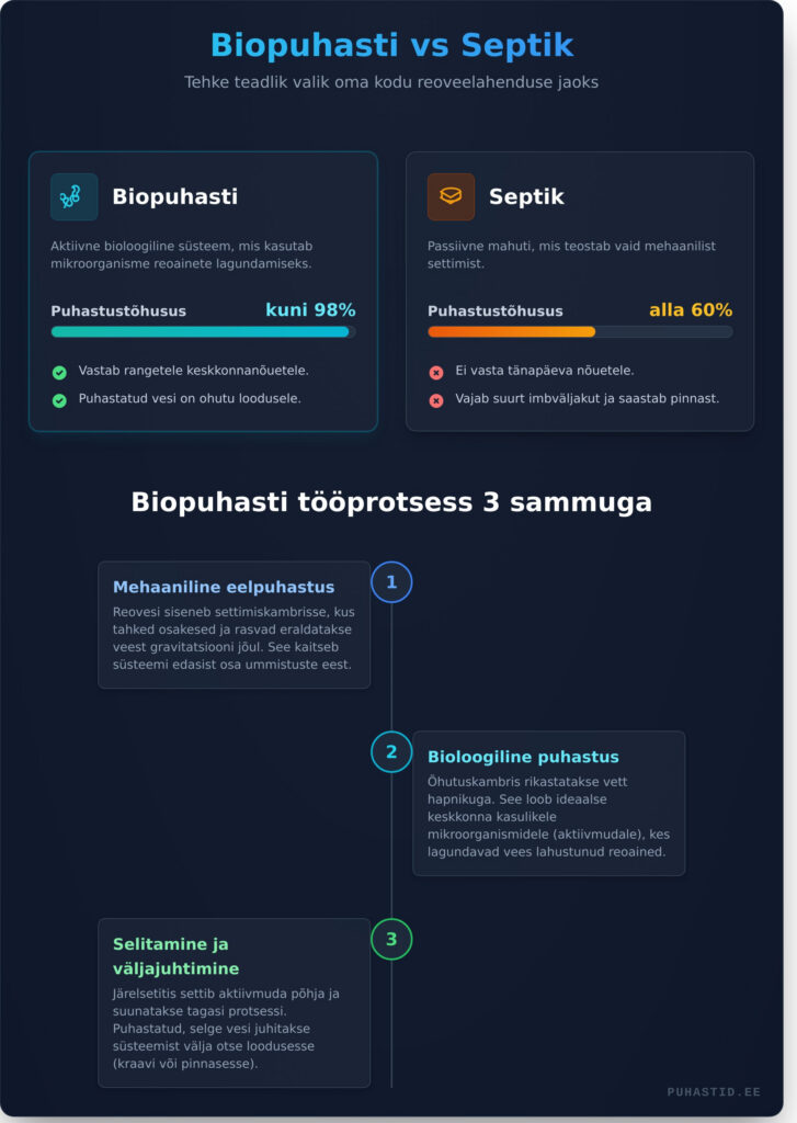 Peamine erinevus seisneb puhastusprotsessi olemuses. Septik on passiivne mahuti, mis teostab vaid mehaanilist settimist, samas kui biopuhasti on aktiivne süsteem, mis kasutab elusorganisme reoainete lagundamiseks.