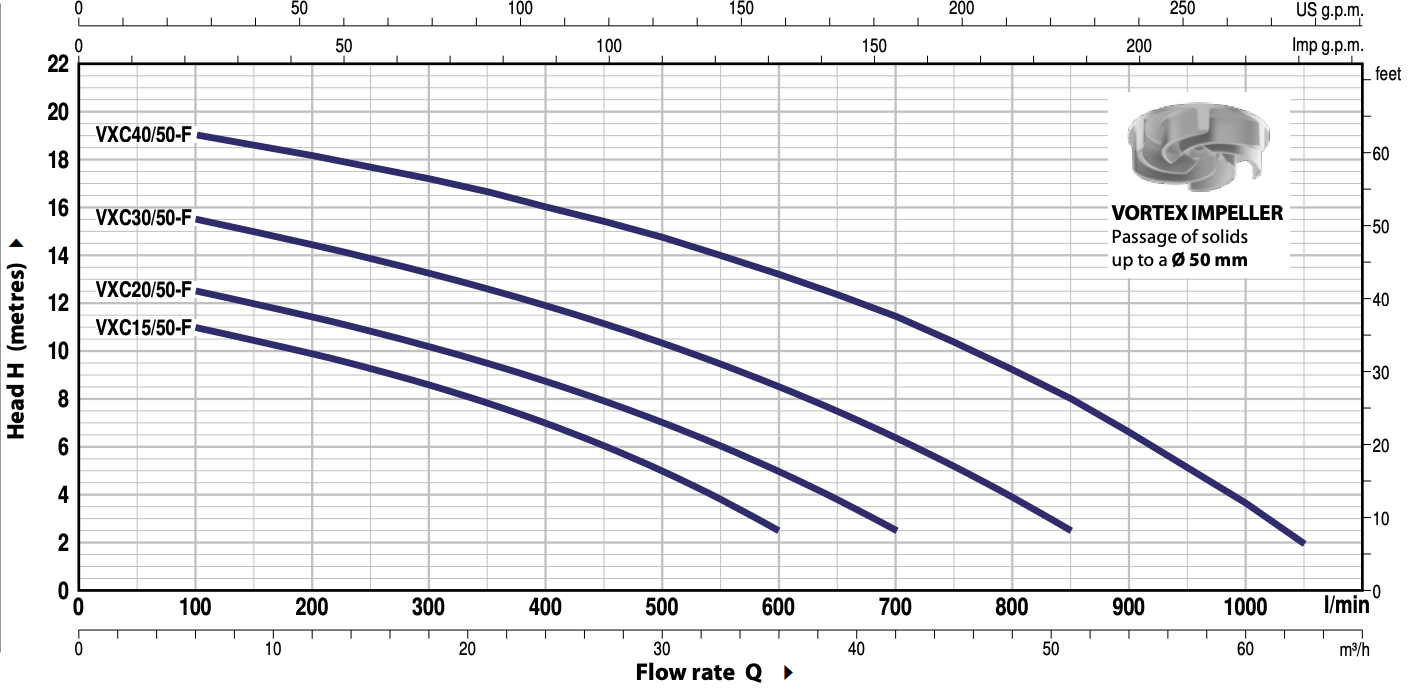 The VXC series of pumps, manufactured from heavy gauge robust cast iron, resistant to abrasion and long lasting, are fitted with a VORTEX impeller and therefore suitable for drainage of refluent water, water mixed with mud, liquids containing air or gas, and putrid muds. They are recommended for fixed installations, when placed in suitable wells, in sewers, tunnels, wells, underground car parks, etc